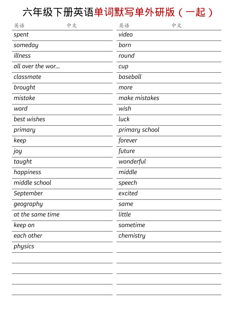 六年级下英语全册单词默写单《外研版(一起)》mohen9997天前更新关注8六年级下英语全册单词默写单《外研版(一起)》此内容为付费阅读,请付费后查看¥9.9钻石会员免费立即购买您当前未登录!建议登陆后购买,可保存购买订单付费阅读 ——预览已结束,还剩2页未读——您已获得此文档下载权限,请点击底部下载完整文档 课程下载: 此处内容已隐藏,请付费后查看 THE END六年级英语 分享QQ空间微博QQ好友海报分享复制链接收藏