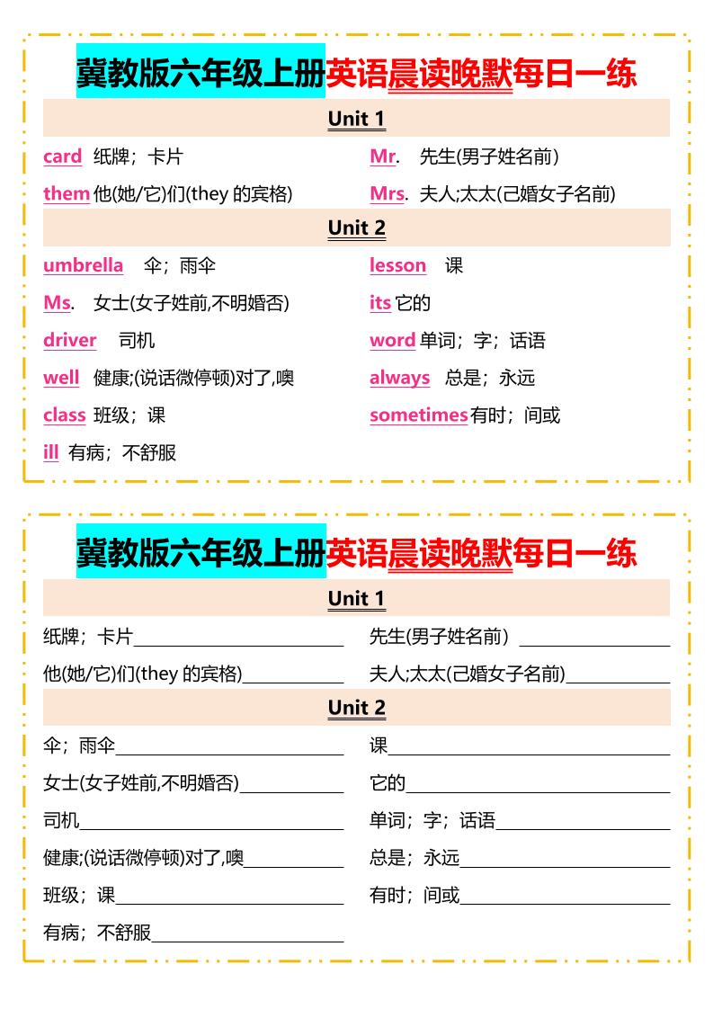 2025年秋冀教版六年级上册英语晨读晚默每日一练mohen9991个月前更新关注1092025年秋冀教版六年级上册英语晨读晚默每日一练此内容为付费阅读,请付费后查看¥9.9钻石会员免费立即购买您当前未登录!建议登陆后购买,可保存购买订单付费阅读 ——预览已结束,还剩2页未读——您已获得此文档下载权限,请点击底部下载完整文档 课程下载: 此处内容已隐藏,请付费后查看 THE END六年级英语 分享QQ空间微博QQ好友海报分享复制链接收藏